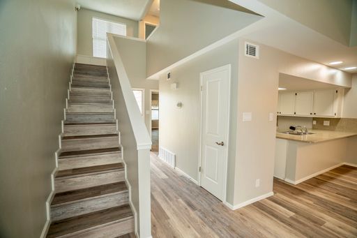 Experience modern living in this stunning, completely remodeled end-unit townhome featuring 3 bedrooms and 2 bathrooms. The home boasts fresh paint, new flooring, contemporary light fixtures, and updated hardware, all highlighted by luxurious vinyl plank flooring throughout. High ceilings and ample natural light enhance the spaciousness of the living areas. The galley kitchen is equipped with brand-new appliances and features a breakfast bar that overlooks the dining area and living room, creating an open feel.