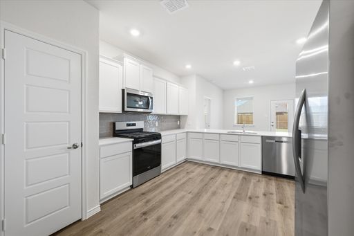 The kitchen showcases modern finishes and comes complete with a refrigerator, and the home also includes a washer and dryer for added convenience. Durable vinyl wood flooring runs throughout the main living areas, while the bedrooms feature comfortable carpeting.
